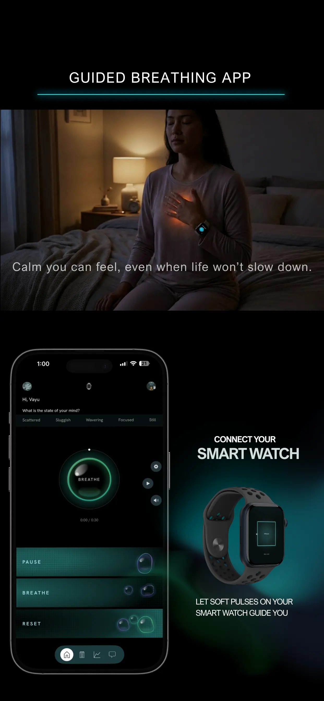The only breathwork platform using haptic cues on wearables to deliver science-backed stress relief, without relying on screens.